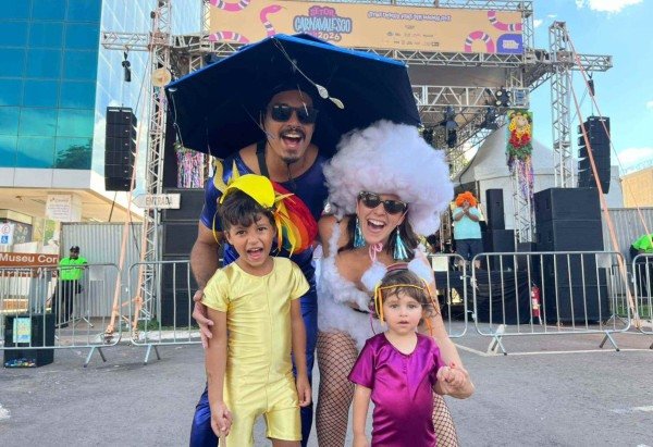 Entre eles, estava a família da doula Bruna Mello, 35 anos, moradora do Córrego do Urubu, ao lado do desenvolvedor Otavio Barbosa, 43, e dos filhos Tiê de Mello, 2, e Nico de Mello, 5. O quarteto chamou atenção pelas fantasias combinadas: nuvem, chuva, arco-íris e sol, respectivamente.