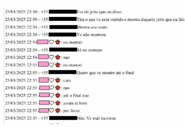 Em outra conversa, ele exige como quer que o conteúdo seja enviado. “Faz do jeito que eu disse. Tira o que você está vestindo e mostra daquele jeito que falei. Mostra seu rosto, você não mostrou.” Ela responde: “Eu mostrei”. “Quero que você mostre até o final”, responde o suspeito.