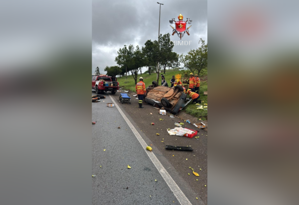 Após sofrer capotamento na BR-020, na descida para Sobradinho, uma mulher ficou presa às ferragens de seu carro na manhã desta segunda-feira (13/4). O tombamento ocorreu após dois veículos colidirem no trecho.