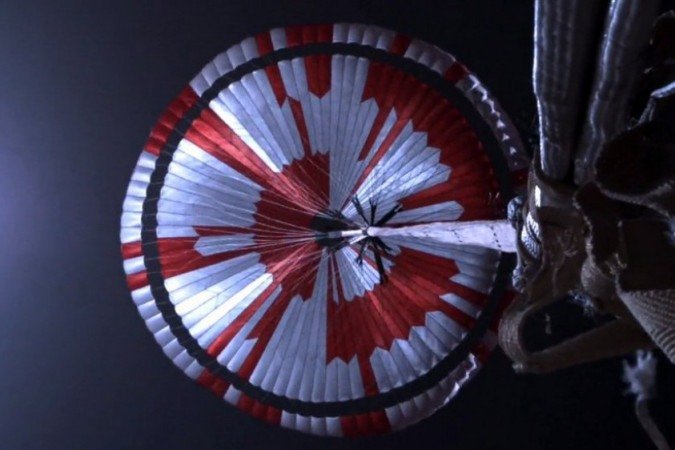 "Usando códigos binários, duas mensagens foram codificadas em branco neutro e laranja" no paraquedas, diz a página do Jet Propulsion Laboratory (JPL) da Nasa, na Califórnia, nos Estados Unidos, que controla a missão Perseverance.