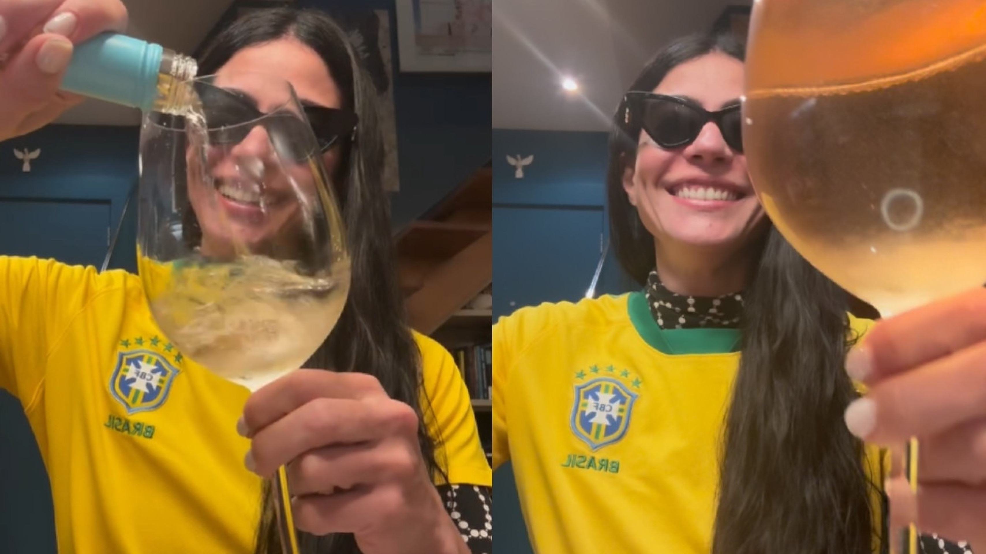Em vídeo publicado nesta segunda-feira (4), a atriz celebrou o momento vestindo a camisa do Brasil, usando óculos escuros e enchendo uma taça de espumante ao som de “Juízo Final”, na voz de Alcione.