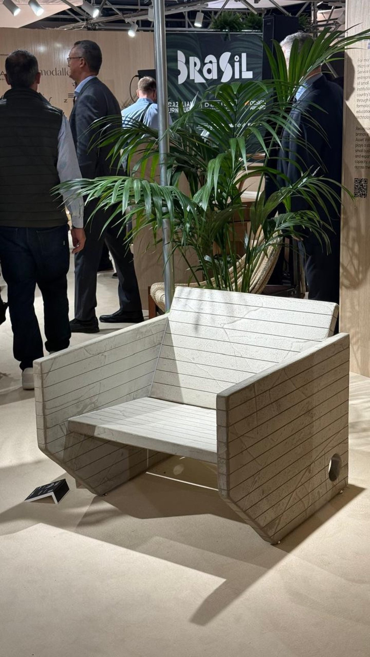 "O conceito surge do meu olhar sobre Brasília, especialmente pela influência da arquitetura marcada por volumes puros, presença escultórica e um equilíbrio entre monumentalidade e leveza. O material feito de pó de pneu, granito e outros materiais, formando uma fibrocerâmica reforça a ideia e incorpora a dimensão de inovação e responsabilidade ambiental. A poltrona Monolito foi a primeira peça, que deu partido de desenho para toda a coleção Monolitos, que tem diversas peças: sofá, mesas e espreguiçadeira, por exemplo", acrescenta.