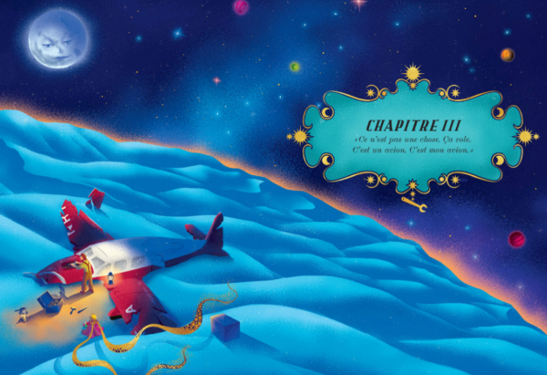 Suas ilustrações com cores intensas contrastam com os desenhos em aquarela e tons pastéis por Saint-Exupéry sobre o jovem herói.