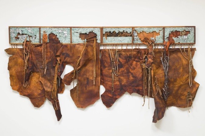 Além de Eiro, Sanvoy traz Lucidez de fuga, trabalho no qual utiliza cacos de vidro temperado em alusão ao material encontrado em prédios de grande porte, como bancos e shoppings. "Uso esse material quase como uma espécie de ironia, esse material que permite a passagem do olhar, mas delimita ambientes. É a ideia de lucidez de fuga, tanto de perda de luz, quanto de uma construção complicada de sociedade", avisa. O caco de vidro também traz uma intenção de pensar as ruínas e vem mesclado a estruturas de couro que, para o artista, remetem à superfície de um corpo. "E esse corpo cria uma relação com esses objetos em vidro. Às vezes, o couro resiste, às vezes sofre um corte. Então tem esse embate desses materiais", diz Sanvoy.