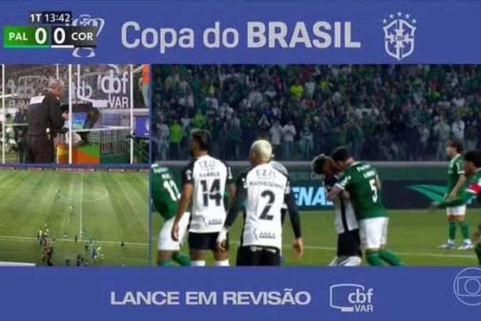 – Ok. Para mim, o jogador número 5 dá uma cabeçada e a bola estava fora de jogo. Escanteio e cartão vermelho para o jogador do Palmeiras – declara.
