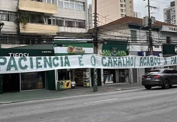 Torcedores do Palmeiras colocaram uma faixa, neste sábado (9), nos arredores do Allianz Parque, como uma forma de protestar pela fase do time. O “recado”, em verde, dizia: “paciência é o c***… Acabou a paz”. Vale lembrar que o Verdão não vence há três jogos (derrotas e eliminação para o Corinthians e empate com o Vitória).