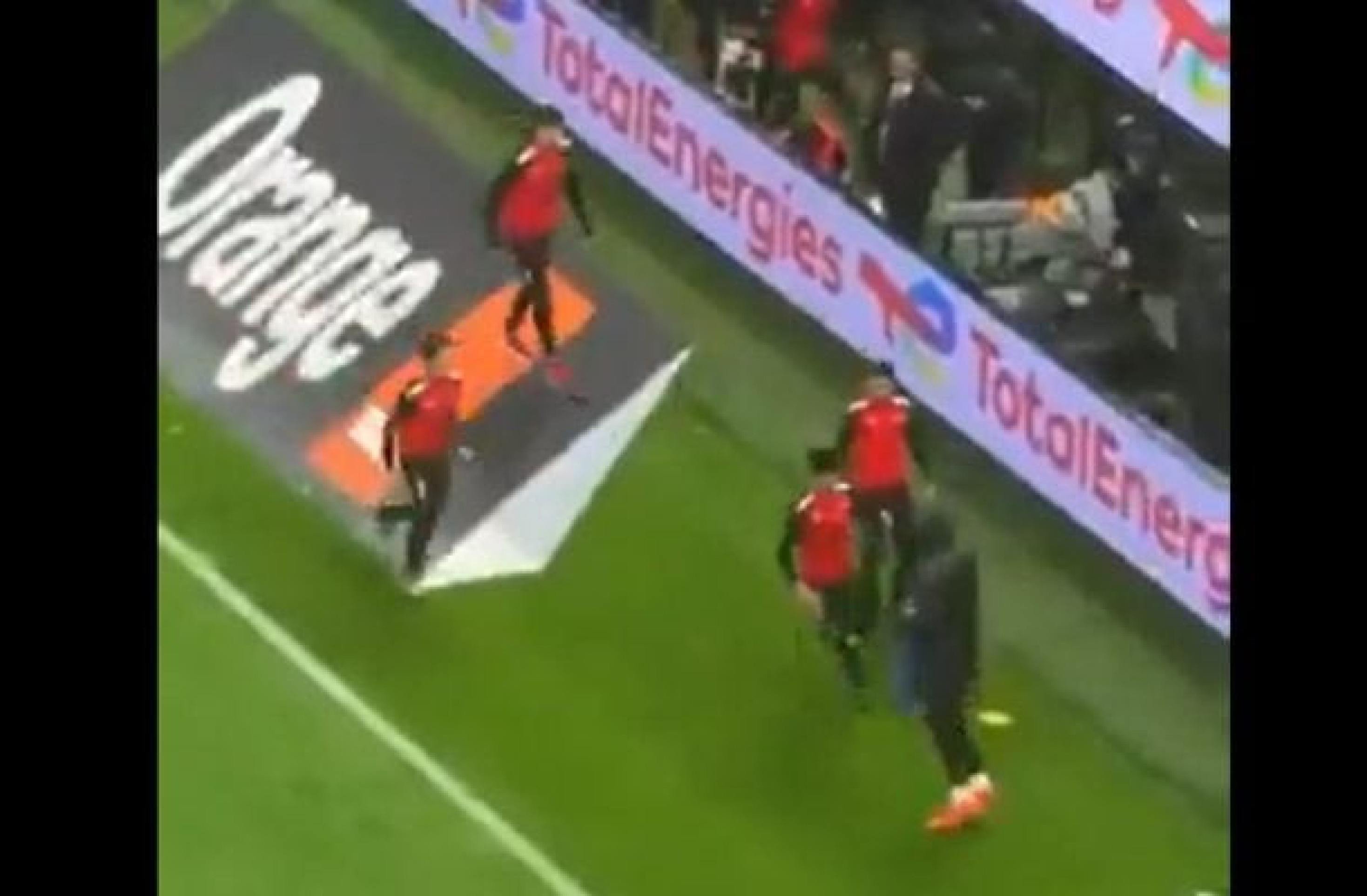Senegalese substitute goalkeeper Yehvann Diouf being attacked by flag bearers during the match after he hung Mendy’s towel in the goal.