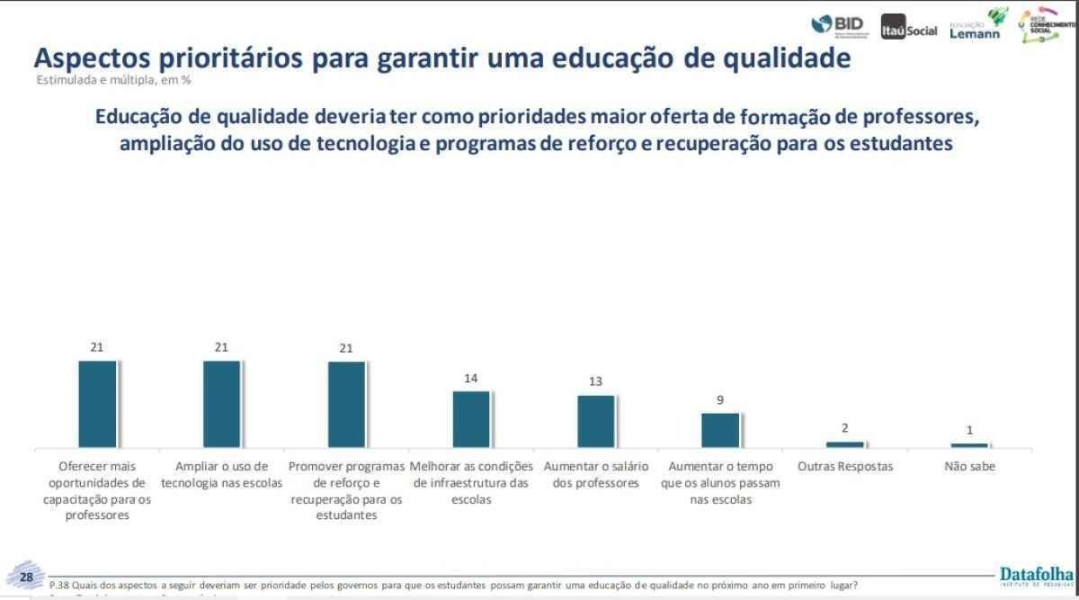 Para melhorar a educação, os entrevistados destacaram que os novos governos devem garantir maior oferta de formação de professores, a ampliação do uso de tecnologia nas escolas e a promoção de programas de reforço e recuperação de estudantes, igualmente com 21%, cada.