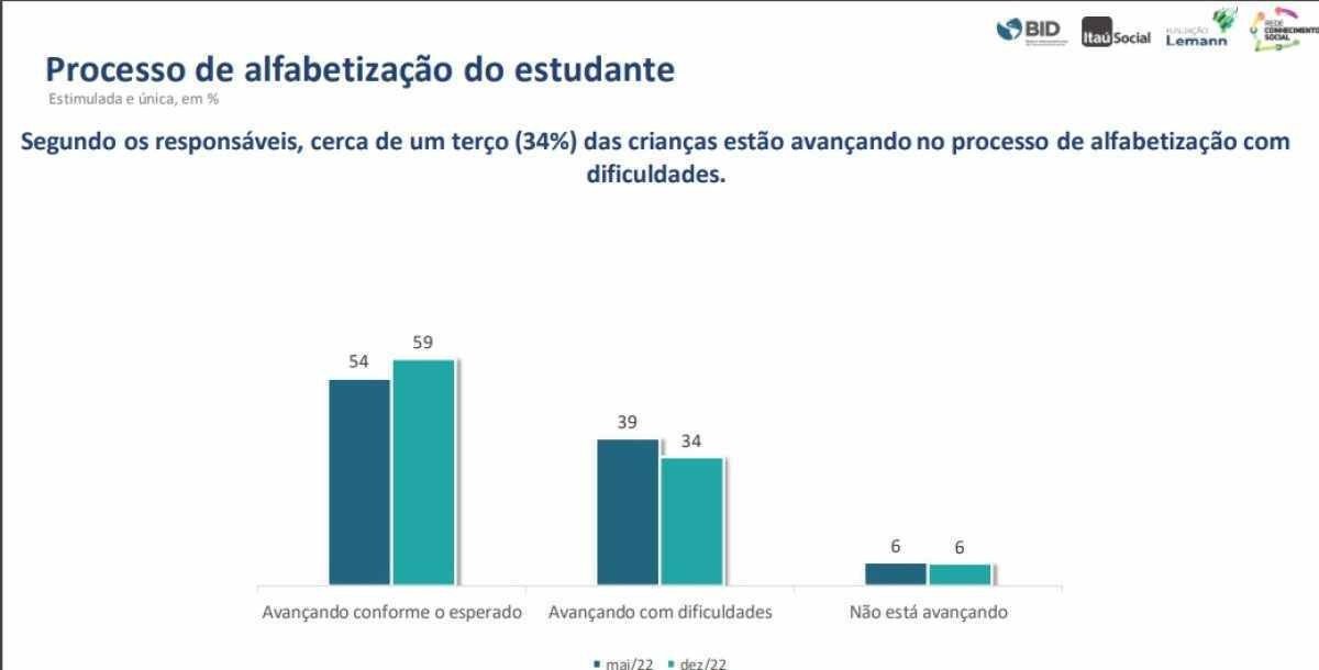 De acordo com pais e responsáveis ouvidos pelo Datafolha, 6% dos alunos não estão avançando e 34% estão avançando com dificuldades no processo de alfabetização. Somados, 40% dos alunos apresentam algum desafio nesse processo. Ainda de acordo com a pesquisa, que ouviu 1.323 responsáveis por 1.863 estudantes de escolas públicas, 78% dos pais concordam que a educação precisa ser a prioridade dos novos governos.