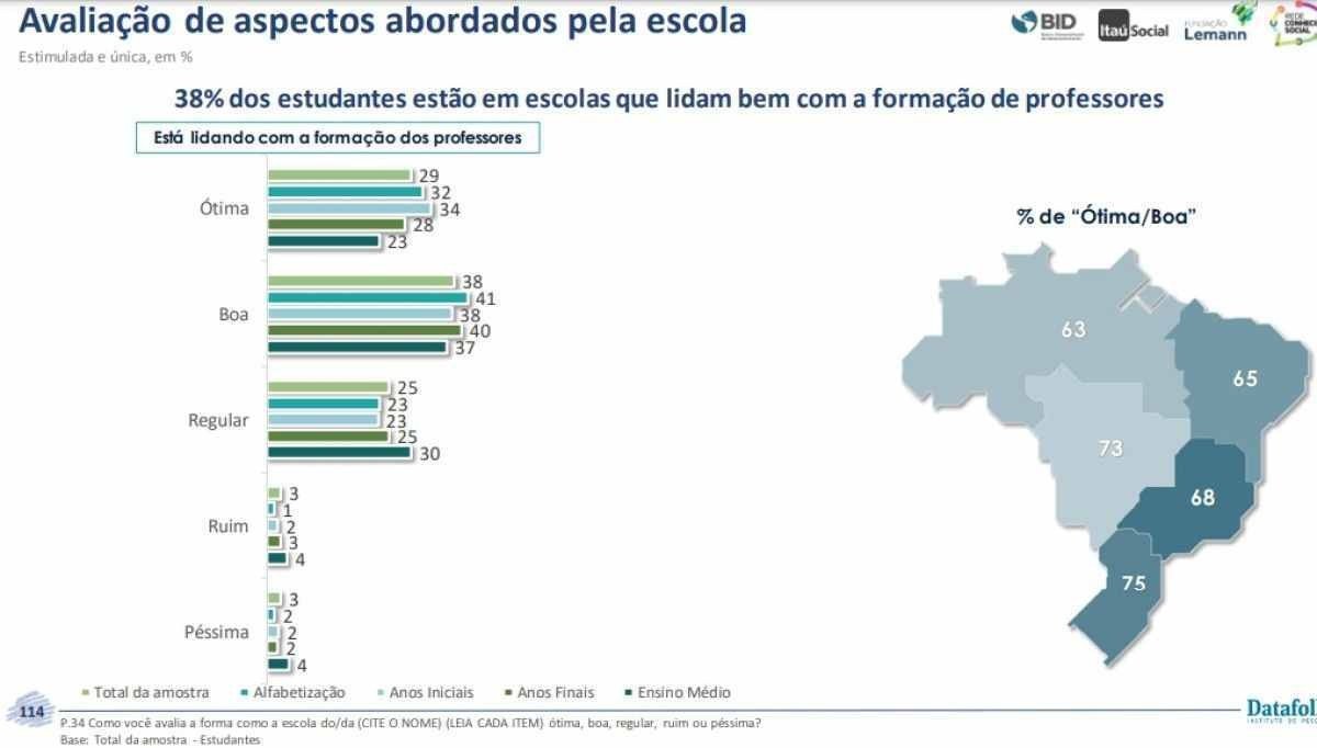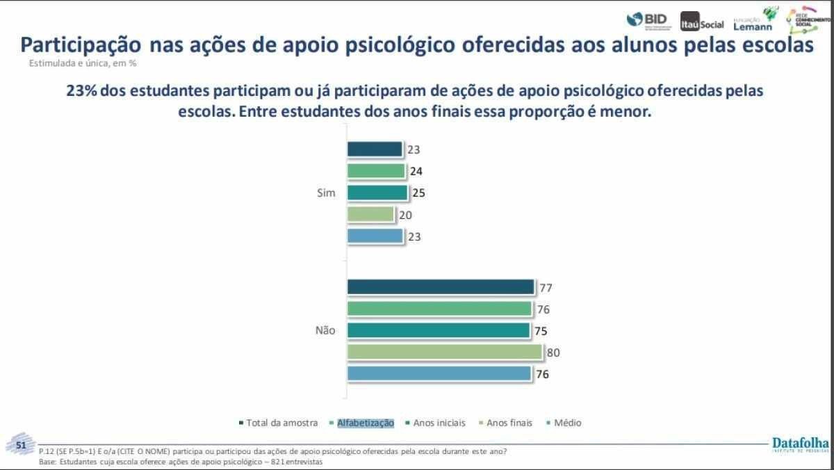 A pesquisa foi encomendada ao Datafolha pela Fundação Lemann, Itaú Social e Banco Interamericano de Desenvolvimento (BID), com apoio da Rede Conhecimento Social. Realizada em dezembro de 2022 com 1.323 pais e responsáveis de todas as regiões do país, o levantamento busca retratar a visão das famílias sobre o primeiro ano de retorno presencial das aulas após a pandemia da covid-19.