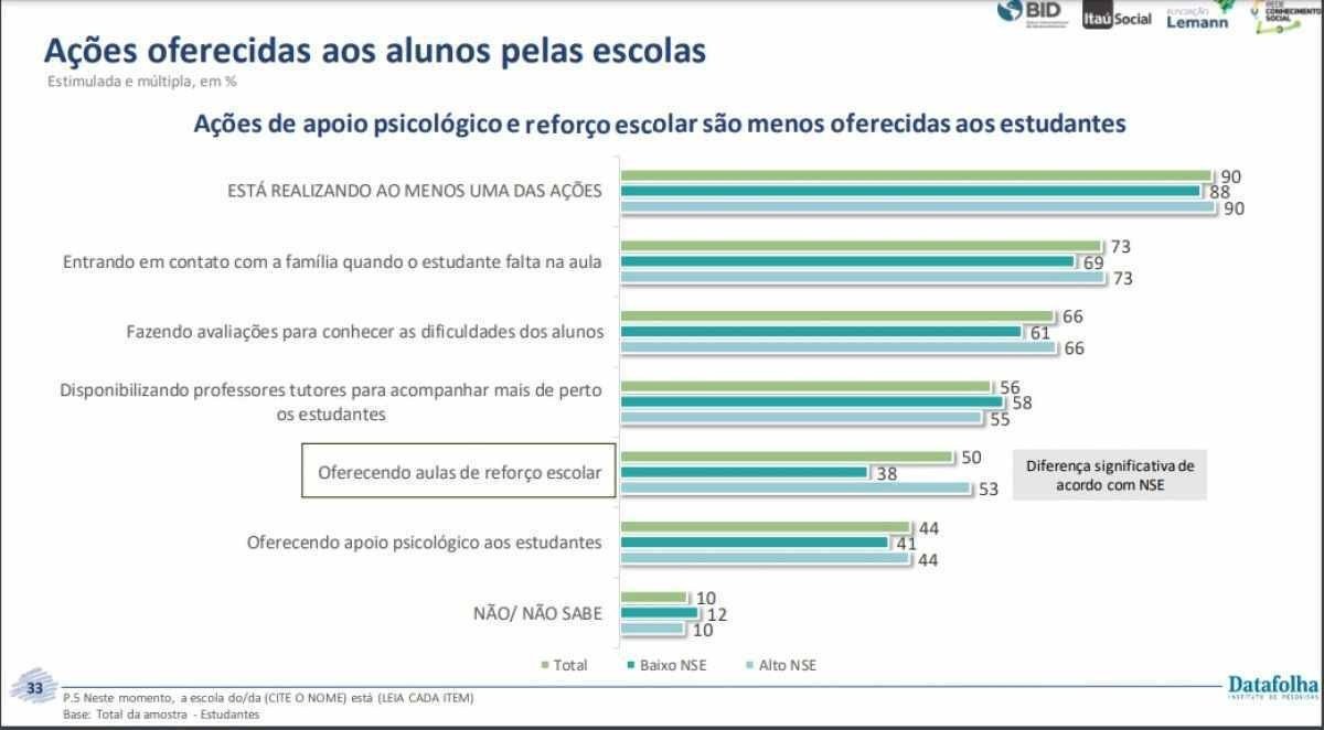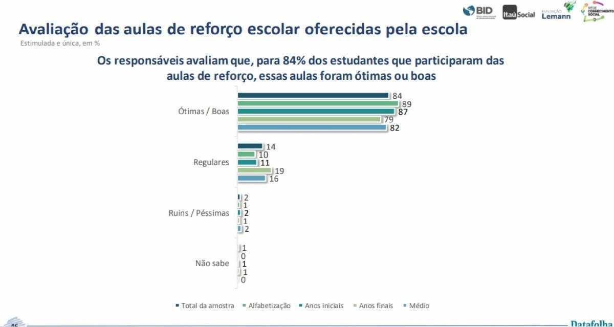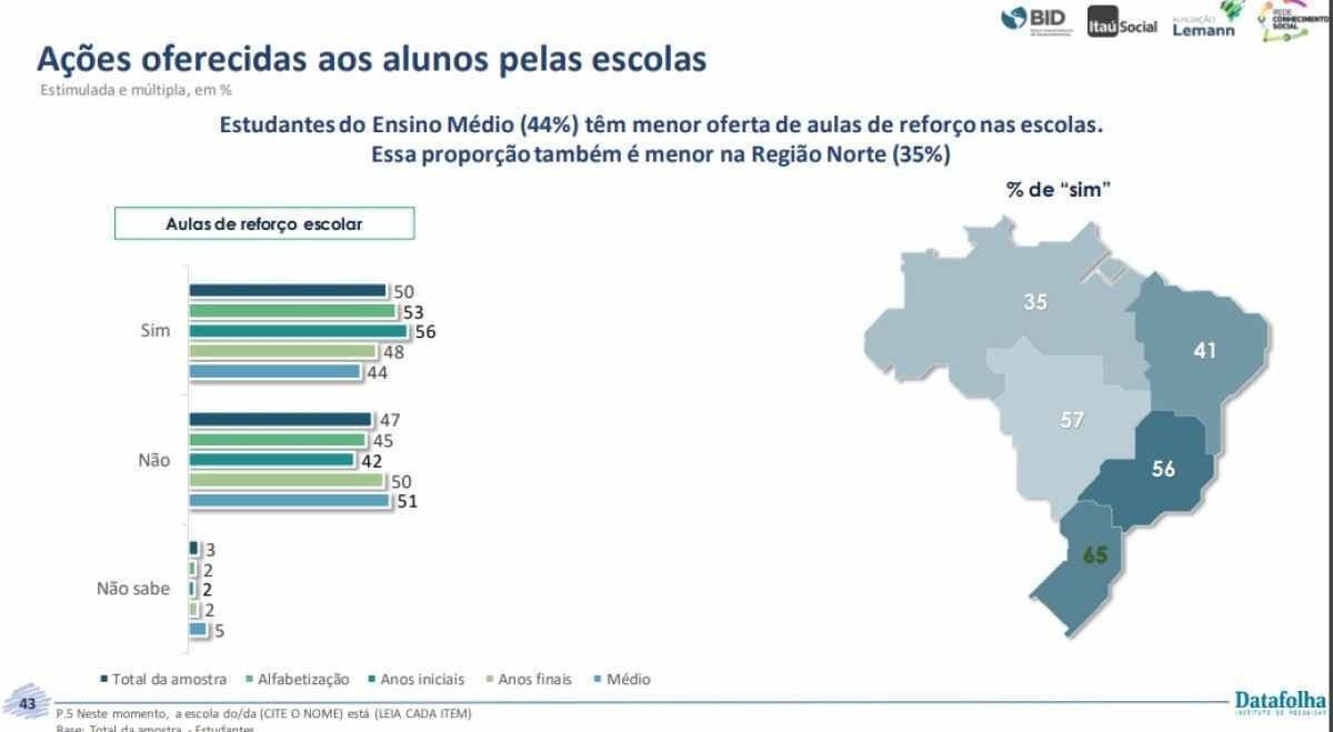 Segundo as famílias, 50% dos estudantes tiveram oferta de reforço escolar pelas escolas, o maior índice desde maio de 2021 (29%). Essa proporção era de 43% no mesmo período do ano anterior, segundo a série Datafolha. Apesar do aumento progressivo desde o início da pandemia, a proporção de estudantes matriculados em escolas que oferecem reforço escolar revela desigualdades, inclusive entre os ciclos da educação básica: estudantes dos anos iniciais têm maior oferta (56%) do que estudantes dos anos finais (48%), de acordo com a pesquisa. As diferenças regionais também são alarmantes, já que alunos da região Sul (65%) têm maior oferta do que aqueles das regiões Norte (35%) e Nordeste (41%).