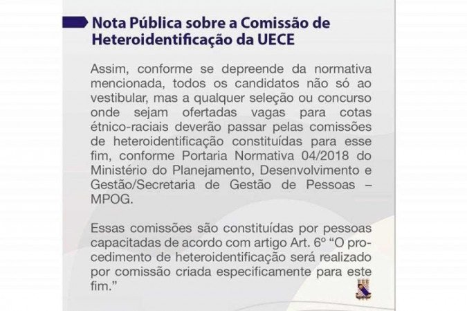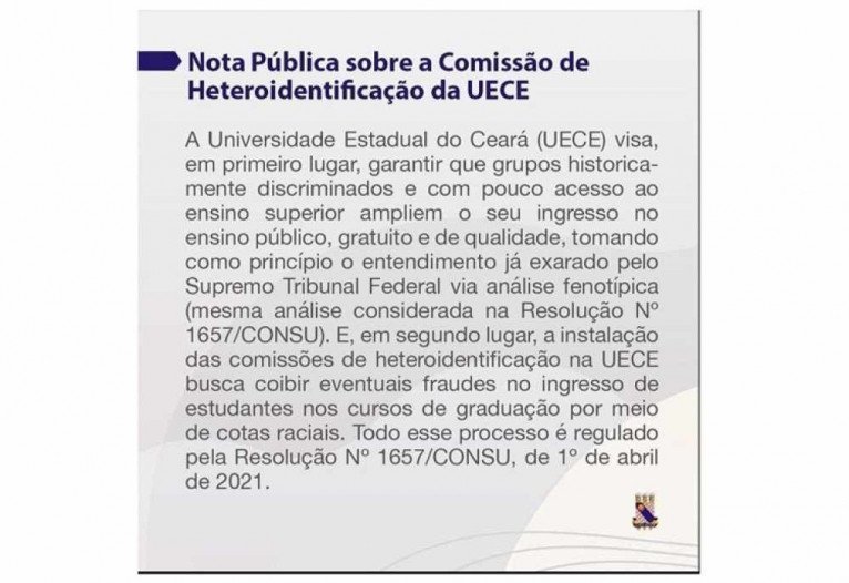 Em nota, a UECE afirma que não tem conhecimento de qualquer reprovação injusta. Segundo a instituição, todas as solicitações recursais foram atendidas, e os candidatos que recorreram, foram avaliados por nova comissão de heteroidentificação.