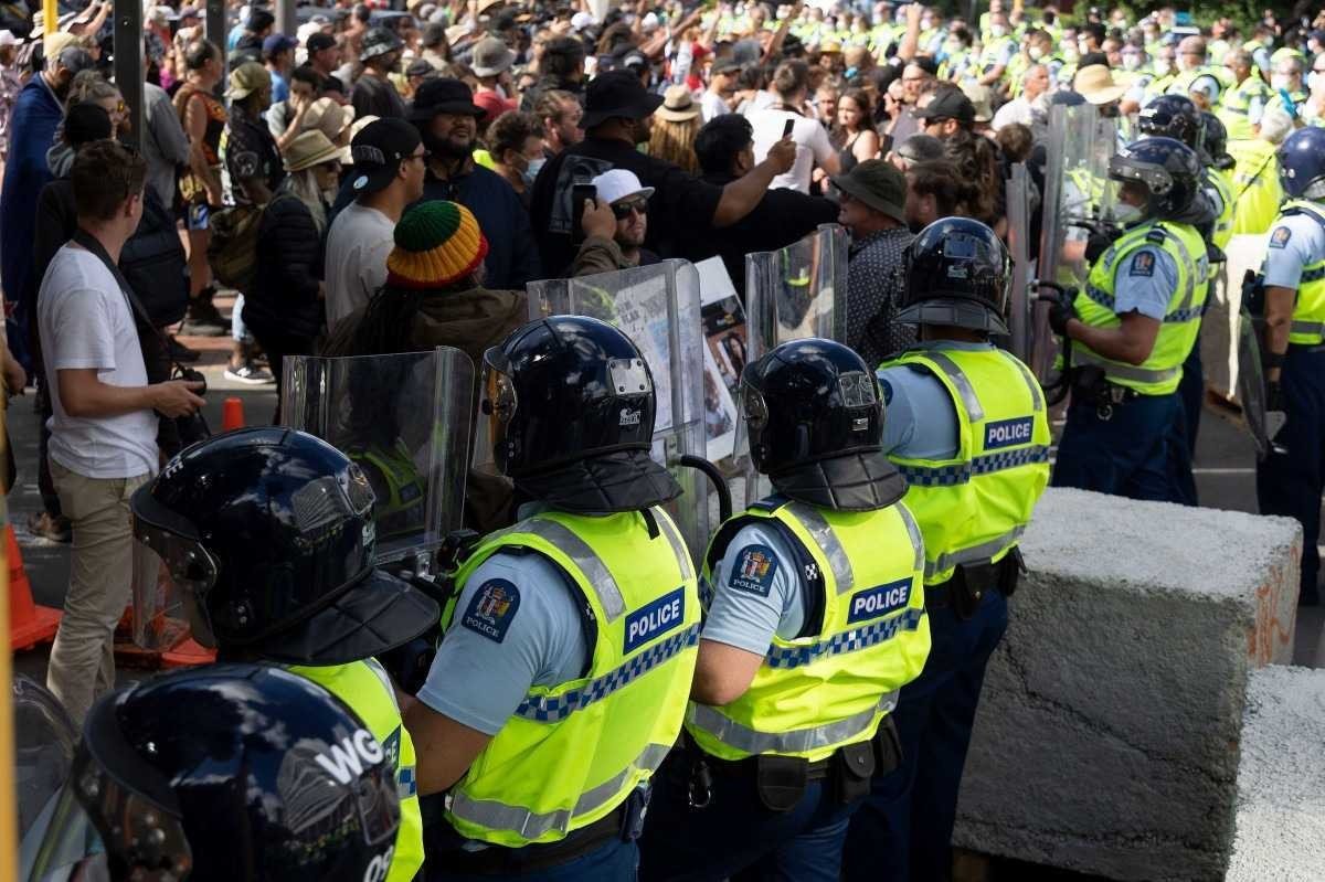 Policiais enfrentam manifestantes antivacinas na Nova Zelândia