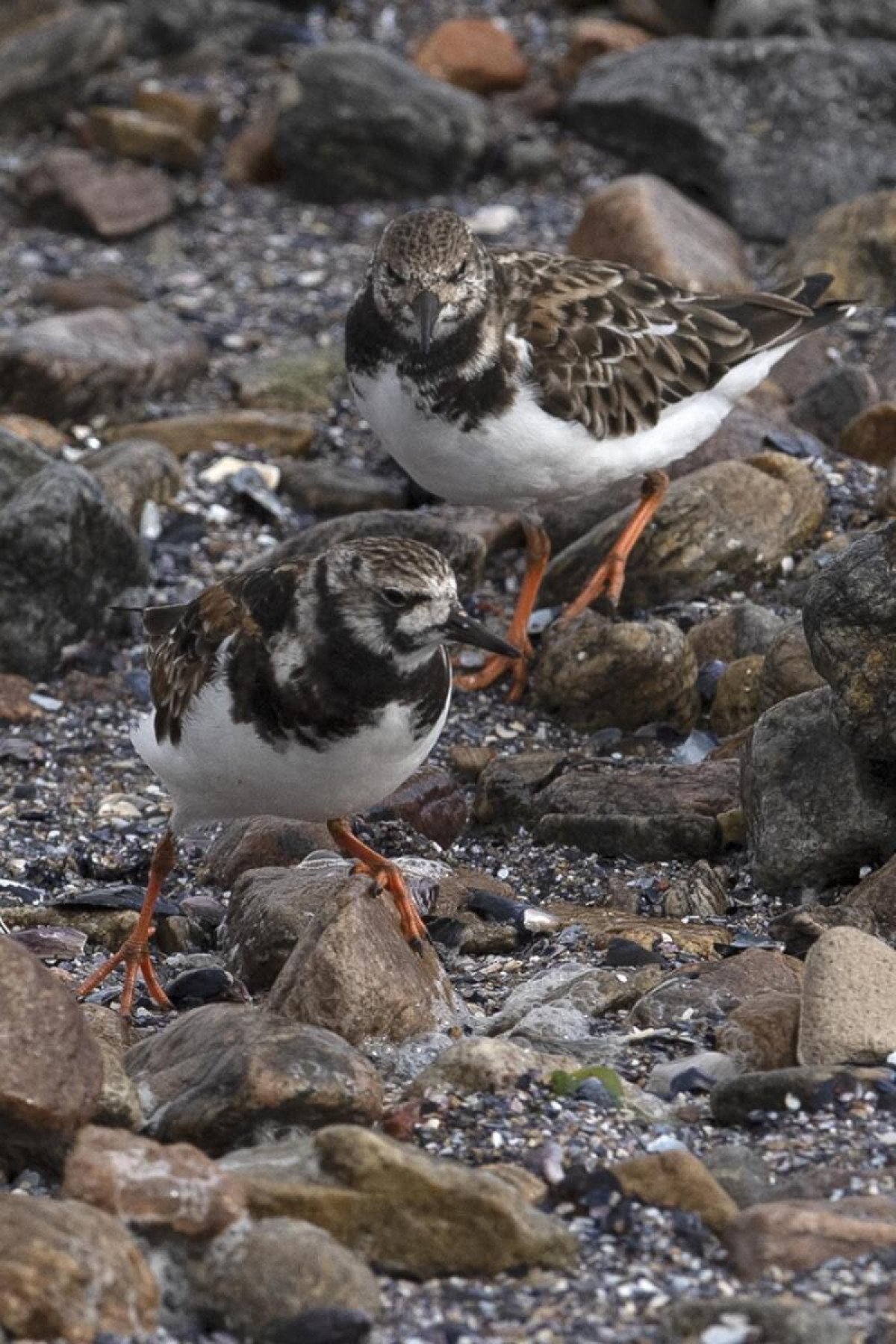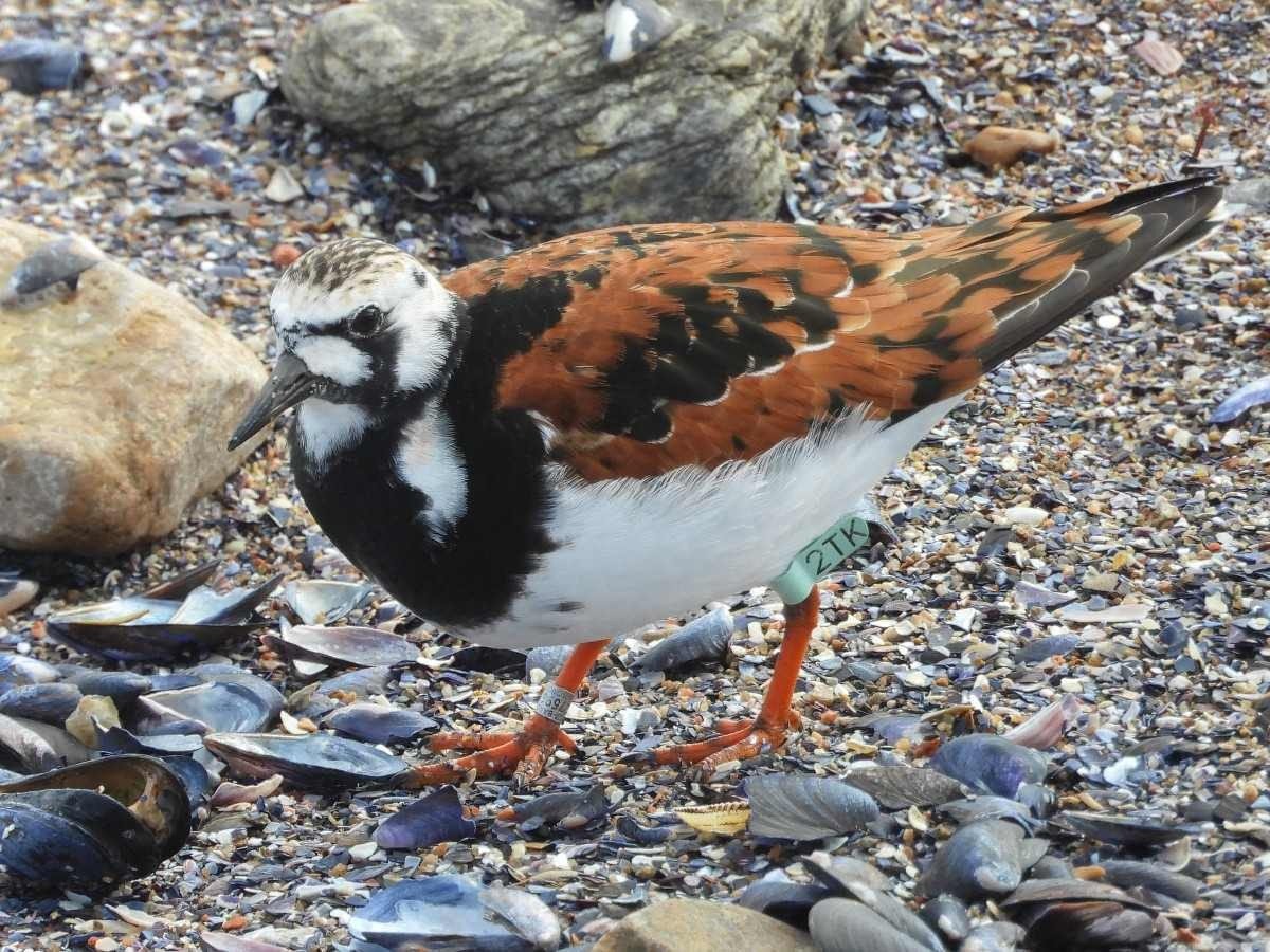 Identificada com uma etiqueta plástica que diz "2TK" em uma pata e uma anilha metálica com nove dígitos na outra, esta rola-do-mar (Arenaria interpres) passou meses alimentando-se de restos de mexilhões, junto de ostraceiros e outras aves, em um grupo de rochas às margens do oceano.