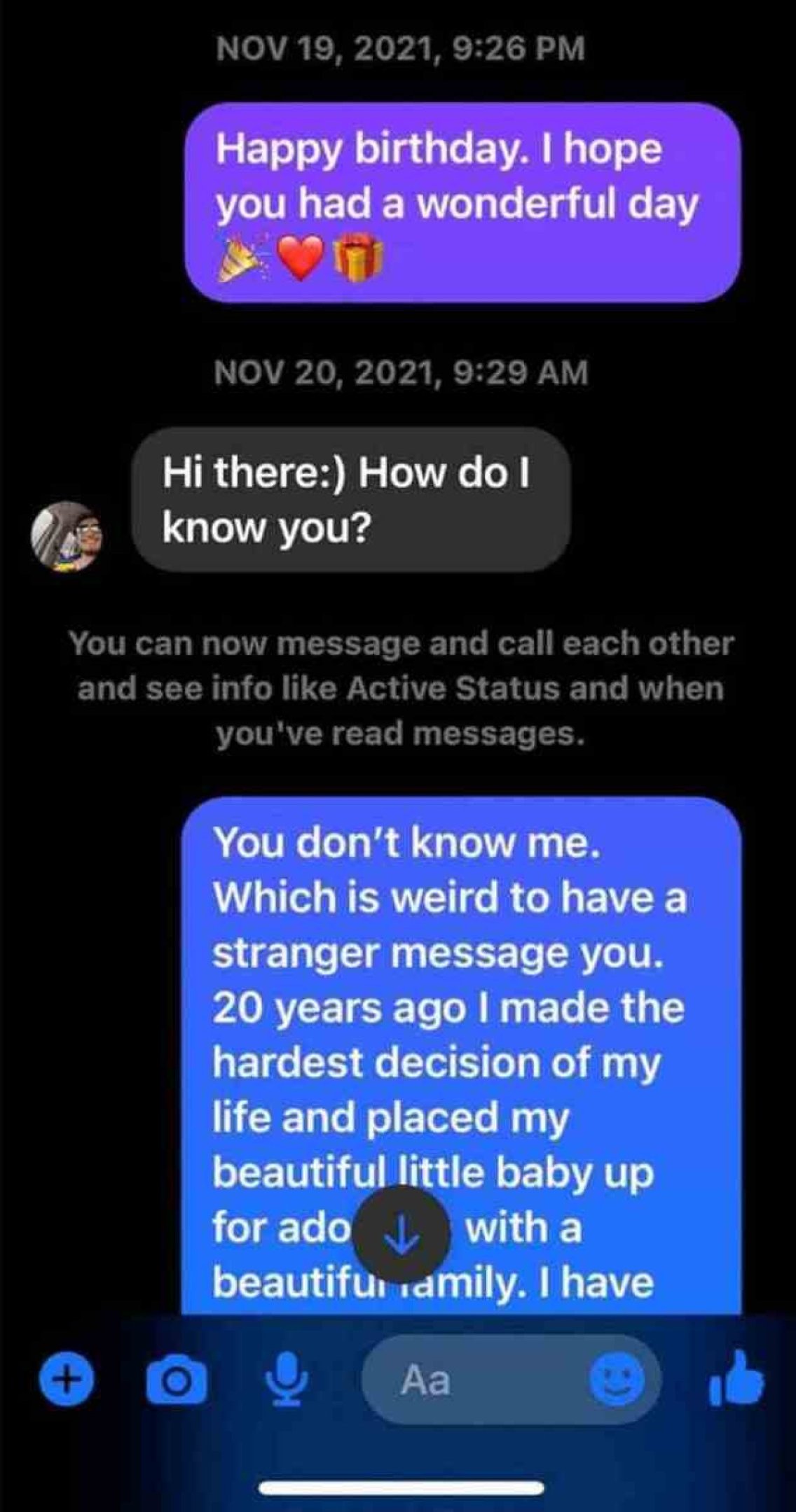 Foi durante o seu aniversário de 20 anos que ele finalmente conseguiu o que sempre sonhou. Pelo Instagram, Holly mandou uma mensagem de parabéns e se apresentou como sua mãe biológica. "Eu estava chorando. Foram emoções muito positivas, mas para mim, este é um dia que eu esperava nos últimos 20 anos da minha vida e imaginar que finalmente estava acontecendo era ultrajante. Foi muito para assimilar", contou ele.