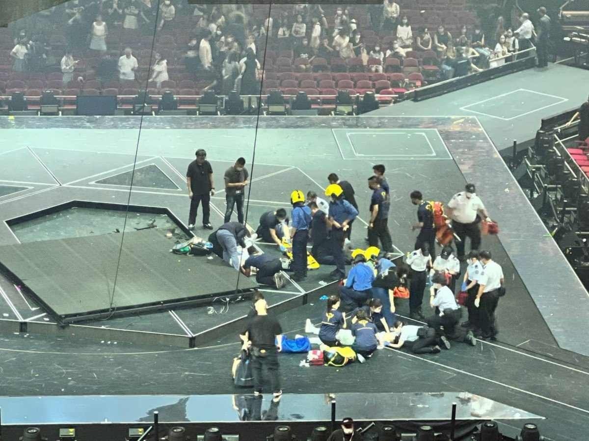 Um telão gigante se desprendeu do teto de um estádio e atingiu dois integrantes da boy band chinesa Mirror, na noite desta quinta-feira (28/7) — horário da China — em Hong Kong. As imagens do acidente, ocorrido durante um show da banda no Hong Kong Coliseum, viralizaram nas redes sociais e chocaram pela intensidade do choque entre o objeto e os artistas. Veja abaixo (cenas fortes):