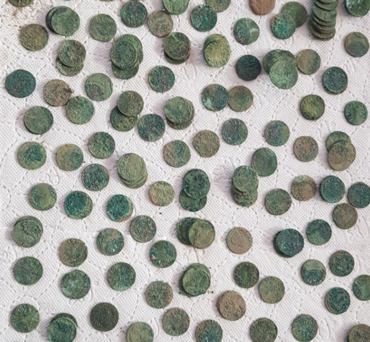O objeto encontrado pesa cerca de 3kg, e as moedas de cobre estavam na coloração verde, em decorrência da oxidação após 400 anos debaixo do solo. Algumas peças também corroeram em camadas, mas 115 delas estavam soltas.