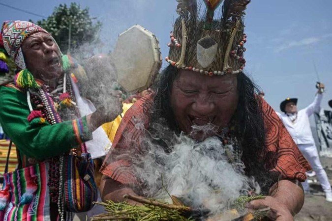 Do topo da sagrada colina San Cristóbal, em Lima, um grupo de 14 xamãs lançou suas previsões sobre o que nos espera nos próximos 12 meses, soprando folhas de coca e pétalas de rosas amarelas sobre fotografias de líderes mundiais como o russo Vladimir Putin, o americano Joseph Biden e o argentino Javier Milei, entre outros.