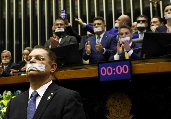 Com esparadrapos na boca, parlamentares da oposição chegaram a sentar nas mesas diretoras para impedir o funcionamento da Câmara e do Senado durante o motim, liderado pelo PL e que ganhou apoio do União Brasil, PP e do Novo.
