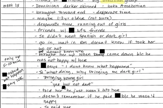 A referência identificada pela BBC News Brasil aparece em anotações manuscritas baseadas em uma entrevista do FBI, de 2 de maio de 2019. O conteúdo trata de pessoas que podem ter sido levadas como possíveis vítimas para encontros sexuais, inclusive menores de idade.