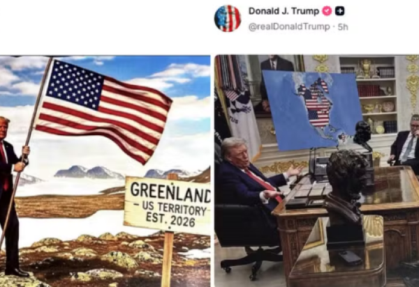Em uma das postagens que gerou maior repercussão, uma imagem sintética mostra Trump fincando a bandeira dos Estados Unidos em solo groenlandês. Na projeção, ele aparece acompanhado pelo vice-presidente, J. D. Vance, e pelo secretário de Estado, Marco Rubio. A imagem inclui ainda uma placa com os dizeres: “Groenlândia: território dos EUA estabelecido em 2026”.