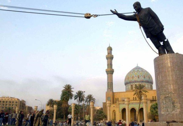 Em 9 de abril de 2003, uma estátua do líder do Iraque, Saddam Hussein, foi derrubada no centro de Bagdá. A placa de metal na base da estátua foi arrancada e o pedestal de mármore foi atacado com uma marreta. Civis iraquianos inicialmente tentaram derrubá-la, escalando a estátua para colocar uma corda em seu pescoço, mas não conseguiram desmontá-la. Foi necessária a ajuda de tropas americanas usando um veículo blindado para finalmente derrubá-la.