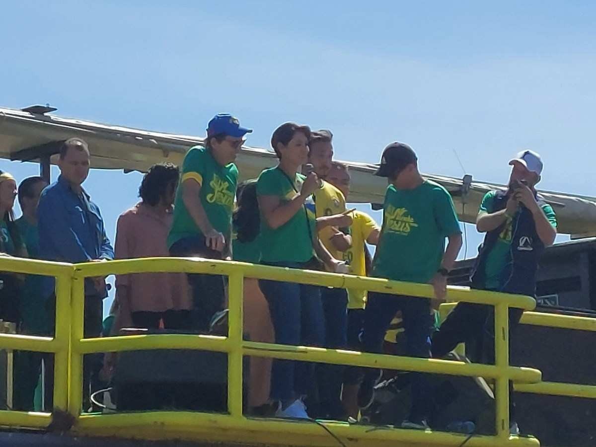 "Hoje o nosso presidente não pôde estar presente, está com agenda, mas nós estamos aqui para representá-lo. Vocês estão aqui para representá-lo. E esse é um dia profético para nossa nação", discursou a primeira-dama. "Nenhum armadilha prosperará contra a nossa nação. Nós declaramos que esta nação é santa. As portas do inferno não prevalecerão contra a nossa família".
