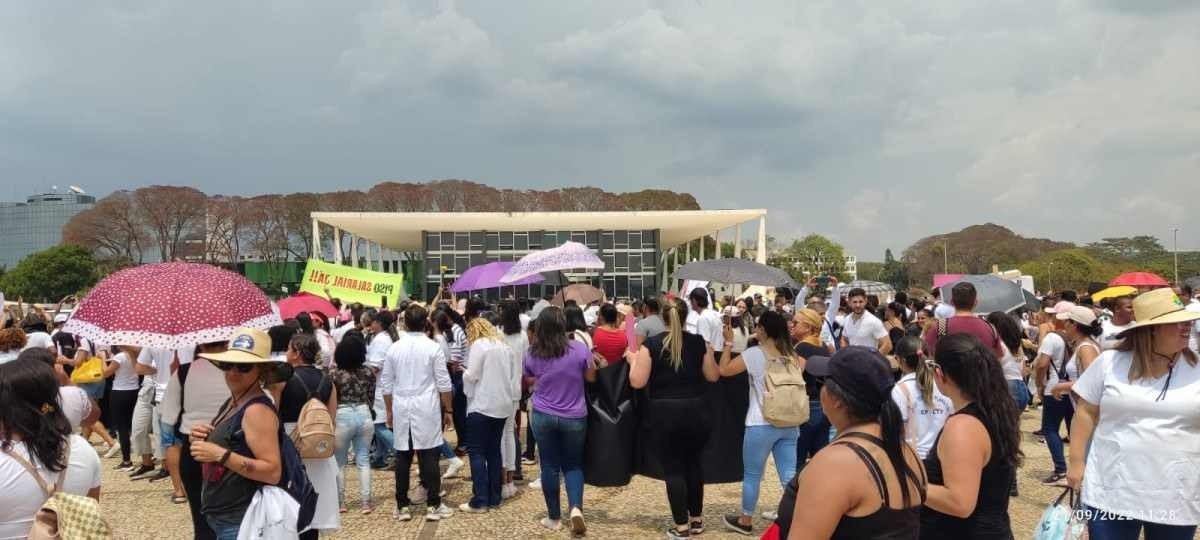 Enfermeiros protestam contra suspensão do piso salarial em frente ao Congresso