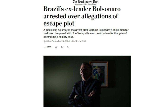 Nos Estados Unidos, o Washington Post informou que a prisão foi decretada poucos dias antes do início do cumprimento da pena de 27 anos determinada pelo STF, relacionada à tentativa de golpe de Estado. Já a France 24, da França, lembrou que o ex-presidente havia sido condenado no início do ano por tentar subverter a ordem democrática e agora aguarda novos desdobramentos judiciais.