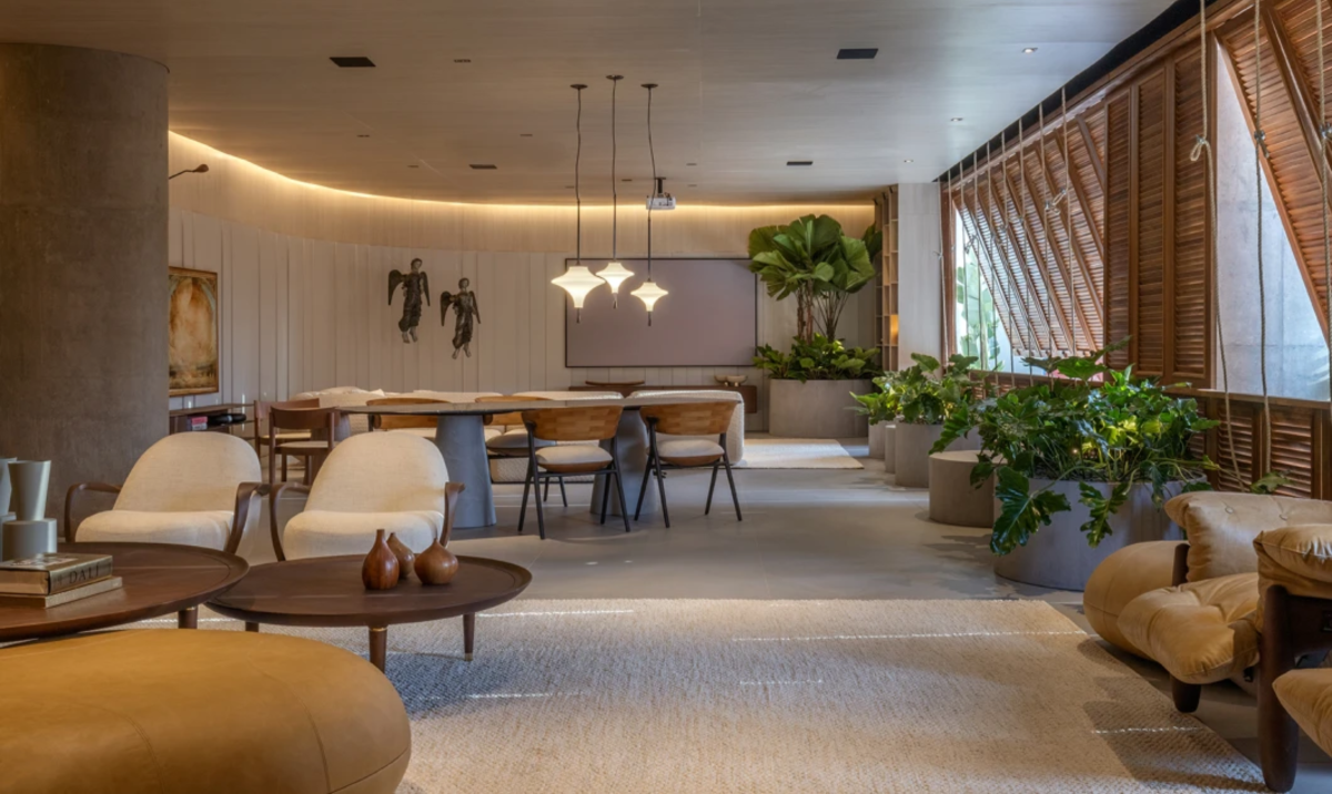 Outro ambiente permeado pela naturalidade é o Relicário, do Studio Marka, que tem painel curvo e fluido de madeira, da Tozetti SIA, circulando e abraçando o espaço, além de forro do mesmo material, que é certificado. Assinado pelos sócios Karine Gonçalves e Marcelo Motta, o ambiente é um convite a permanecer de forma atenta aos sentimentos e às vivências. "Pensamos no momento recém-vivenciado, na necessidade de introspecção, na convivência rara, em que apenas pessoas íntimas e especiais alcançam esse lugar e, assim, apostamos em formas orgânicas, leveza no olhar e no vivenciar, ambientes integrados, despretensiosos e circulação fluida", explicam os sócios.