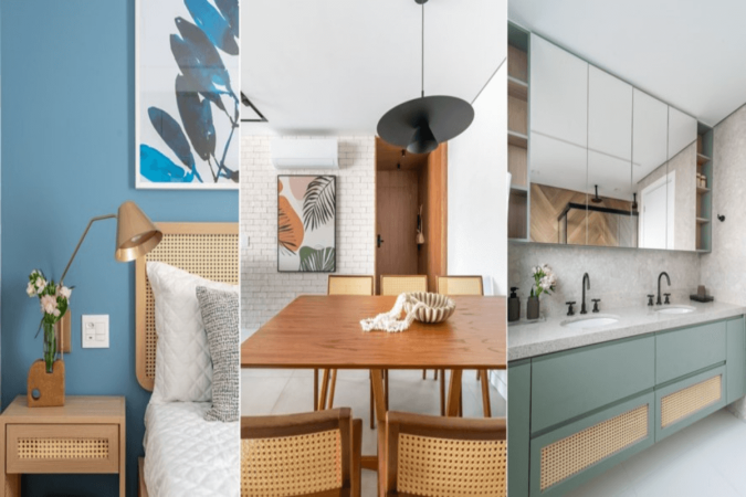 Entre as utilizações mais canônicas da palhinha está o revestimento de encostos e assentos de cadeiras, emprego que se perpetua até hoje em designs que combinam o moderno com o tradicional e que deixam o item como protagonista das peças. A arquiteta revela que esse visual é perfeito para salas de jantar, estar e áreas de convívio. “O único cuidado por aqui é garantir que haja harmonia com o todo planejado para o ambiente”, explica.