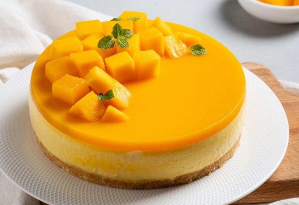 Bata a manga e o açúcar no liquidificador até obter um purê. Dissolva a gelatina conforme as instruções da embalagem e misture ao purê de manga. Despeje cuidadosamente sobre a torta com o recheio já firme e leve à geladeira por mais 1 hora. Após a cobertura firmar, desenforme a torta com cuidado. Decore com cubos de manga e folhas de hortelã. Sirva gelada.