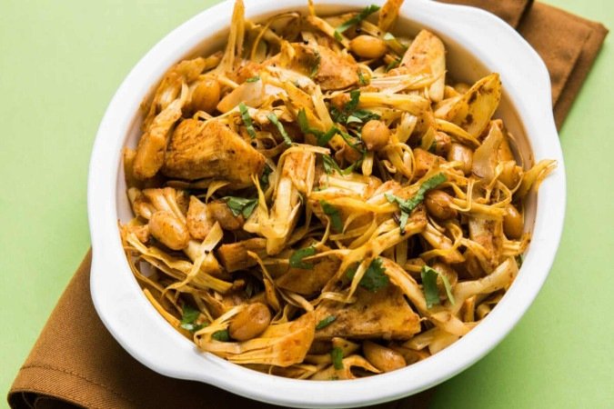 Lave bem a jaca em água corrente. Passe o óleo nas mãos e na faca e corte a jaca em pedaços. Lave novamente para sair todo o leite liberado pela fruta. Transfira a jaca para uma panela de pressão, cubra com água. Feche a panela e leve ao fogo médio por 40 minutos após iniciar a pressão. Após, retire do fogo, espere sair a pressão e escorra a água. Deixe a jaca esfriar e descarte a casca. Após, desfie a polpa e reserve.
