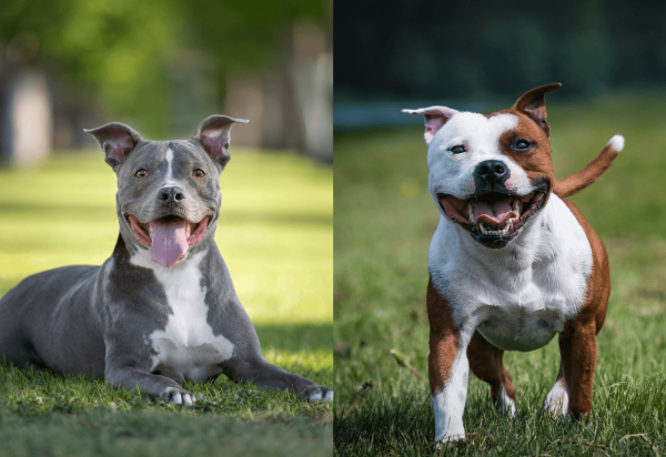 Essa diferença na conformação física é resultado direto dos objetivos da criação de cada raça e pode ser percebida na movimentação: o pitbull tende a ser mais ágil e leve, enquanto o amstaff é mais firme e robusto.
