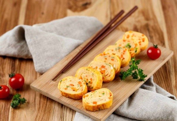Com a ajuda de uma espátula de silicone, enrole a omelete de um lado ao outro, formando um rolinho, e empurre-o para um lado da frigideira. Adicione mais um pouco da mistura de ovos, espalhando até encostar no rolinho já formado. Assim que firmar, enrole novamente sobre a primeira parte. Continue adicionando camadas finas de ovos e enrolando até utilizar toda a mistura. Retire o rolinho pronto da frigideira e deixe descansar 2 a 3 minutos. Em seguida, corte em fatias de cerca de 2 cm e sirva.