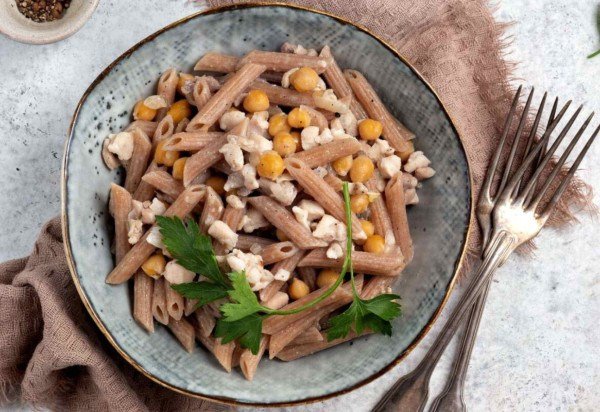 Penne integral com frango e grão-de-bico