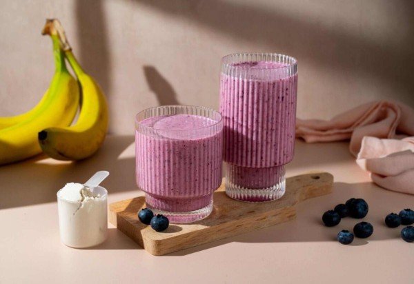 Vitamina proteica de banana e mirtilo