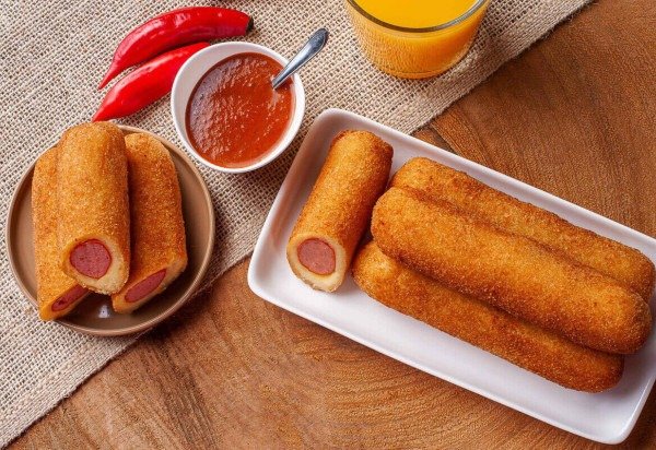 Com a ajuda de uma colher, pegue um pouco de massa e abra na palma da mão, recheie com a salsicha e feche enrolando ao redor dela, elevando a parte superior e inferior sobre as pontas. Repita o processo com toda a massa e passe os enroladinhos no ovo e na farinha de rosca. Reserve. Em uma panela, coloque o óleo e leve ao fogo médio para aquecer. Aos poucos, disponha os enroladinhos na panela e frite até dourar. Depois, coloque-os em um recipiente com papel-toalha para escorrer o excesso de óleo e sirva em seguida.