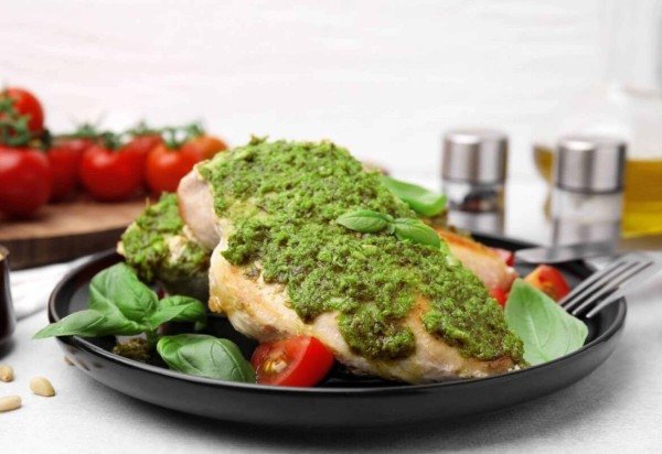 Frango grelhado com pesto de manjericão e espinafre