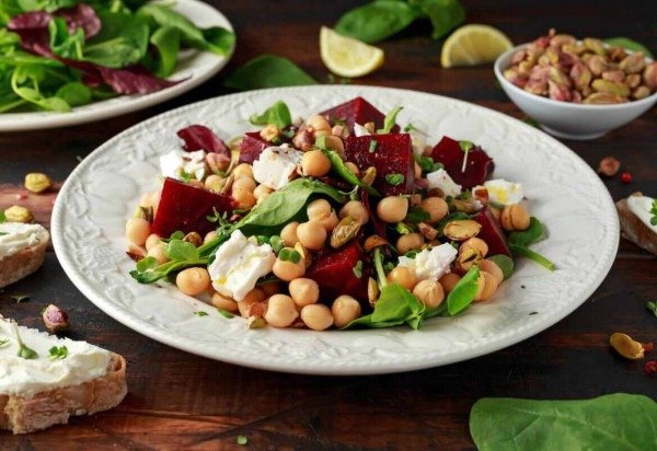 Salada de grão-de-bico com queijo e beterraba