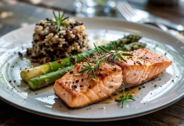 1. Salmão grelhado com arroz selvagem e aspargos
