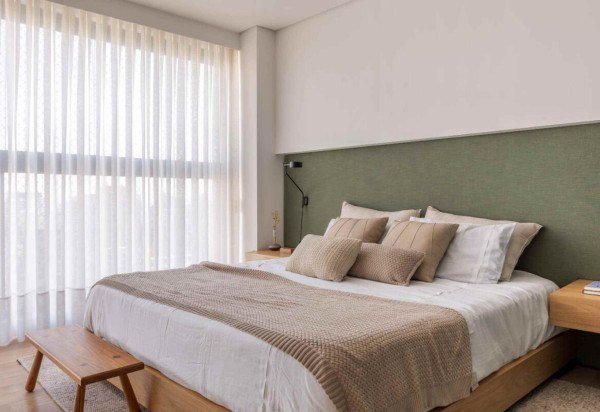 Item primordial para noites bem-dormidas, a cama é o elemento que dita o restante do projeto e seu tamanho deve ser proporcional ao ambiente, por exemplo: camas king-size exigem espaços amplos, enquanto modelos queen ou de casal são mais versáteis e se adaptam a diferentes plantas. “Na hora de comprar o colchão, encare como um investimento em bem-estar, pois um modelo de densidade e suporte adequados à postura fazem toda diferença no descanso”, completa Raphael Wittmann.