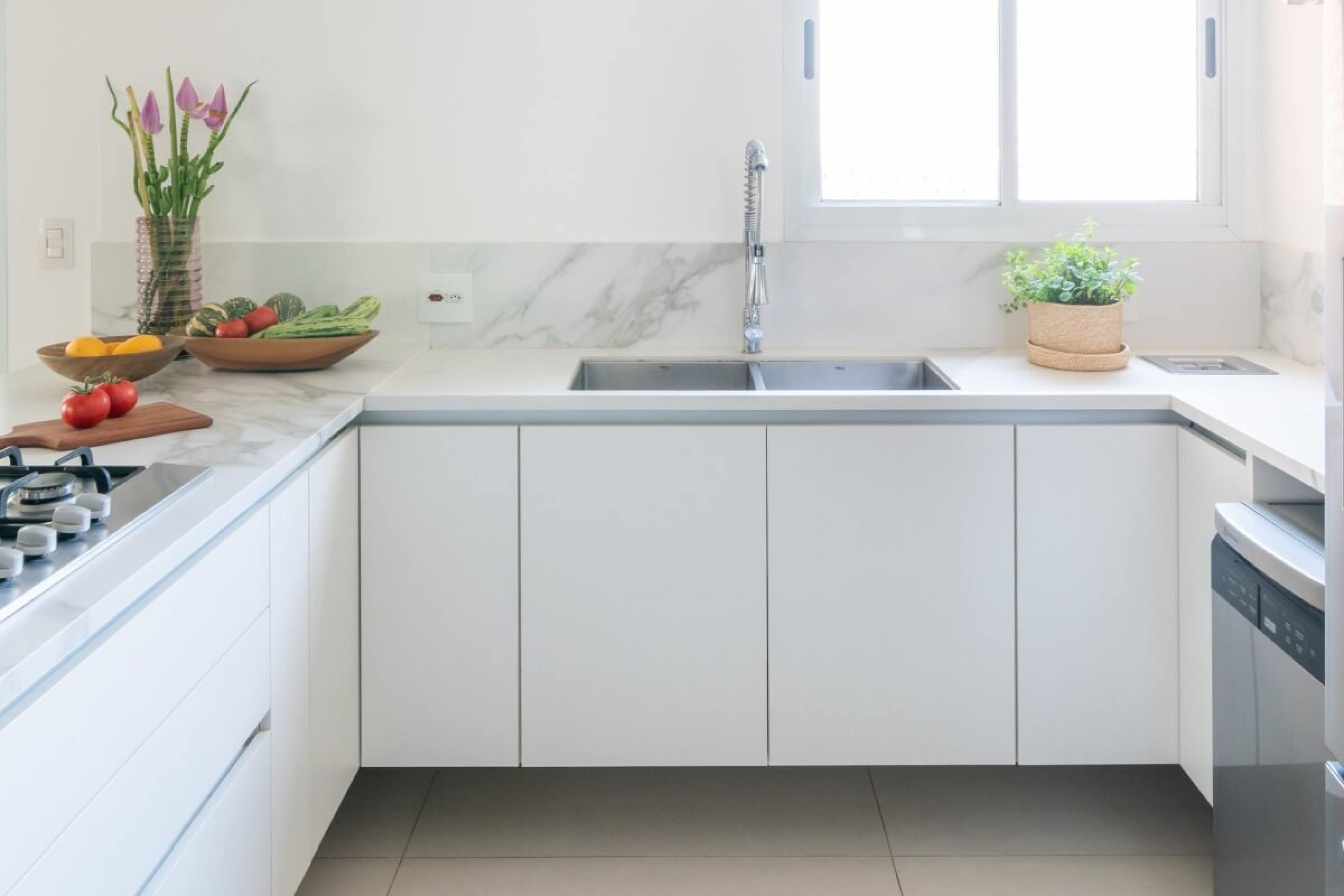 Em uma situação oposta, quando as dimensões da cozinha permitem, a instalação de duas cubas, uma ao lado da outra, é uma mão na roda para quem precisa ganhar tempo em tarefas simultâneas. “Esta estratégia também é eficaz sob a ótica de questões religiosas ou culturais, caso da cozinha Kosher, que precisa da separação entre alimentos e carnes, uma vez que não podem ter contato durante o preparo”, contextualiza a profissional.
