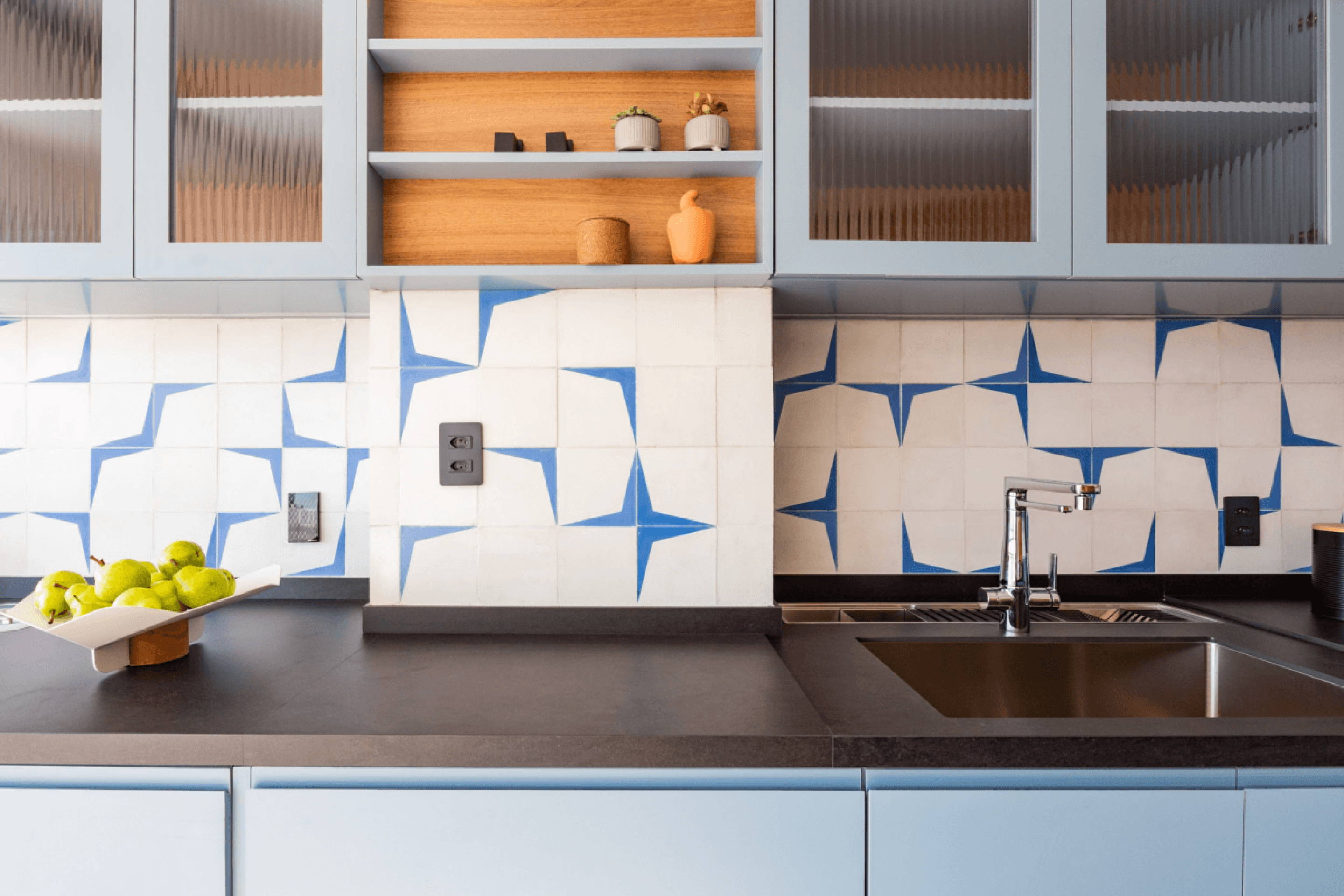 O setor que compreende a parede entre a bancada e os armários, comumente conhecido como backsplash, já é um clássico quando o assunto é um revestimento estilizado. Seja no azulejo, no formato 20 x 20 cm, ou em outras versões, a profissional ressalta o protagonismo de uma cor monocromática ou a associação de tons por meio de desenhos criativos. “É muito interessante elaborar a montagem, que acontece tal qual um quebra-cabeças”, analisa Mari Milani.