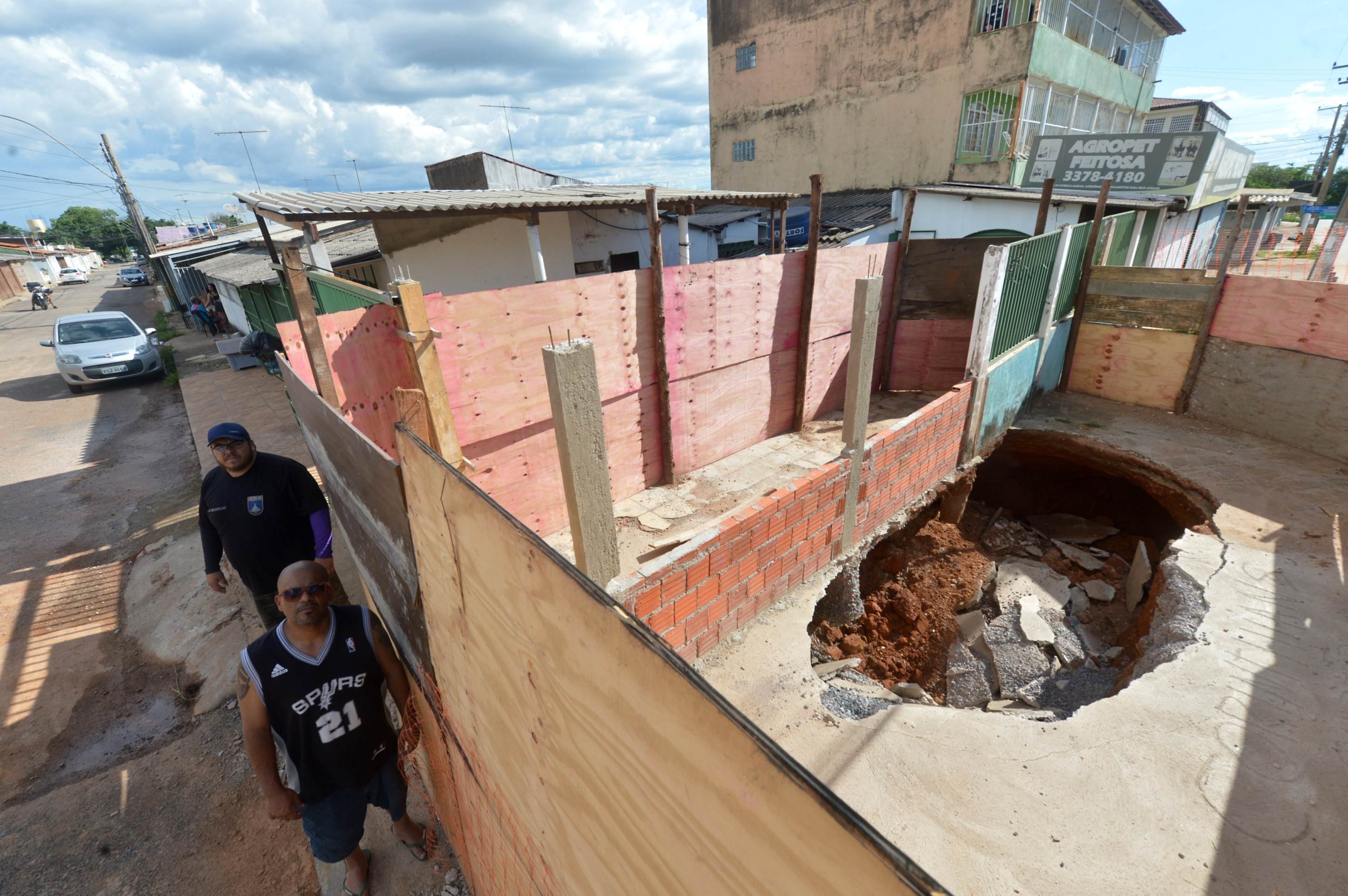 Buraco que havia sido fechado pela Caesb reapareceu após chuvas, provocou transbordamento de esgoto, rachaduras em imóvel vizinho e prejuízos financeiros. Área segue isolada e sob monitoramento