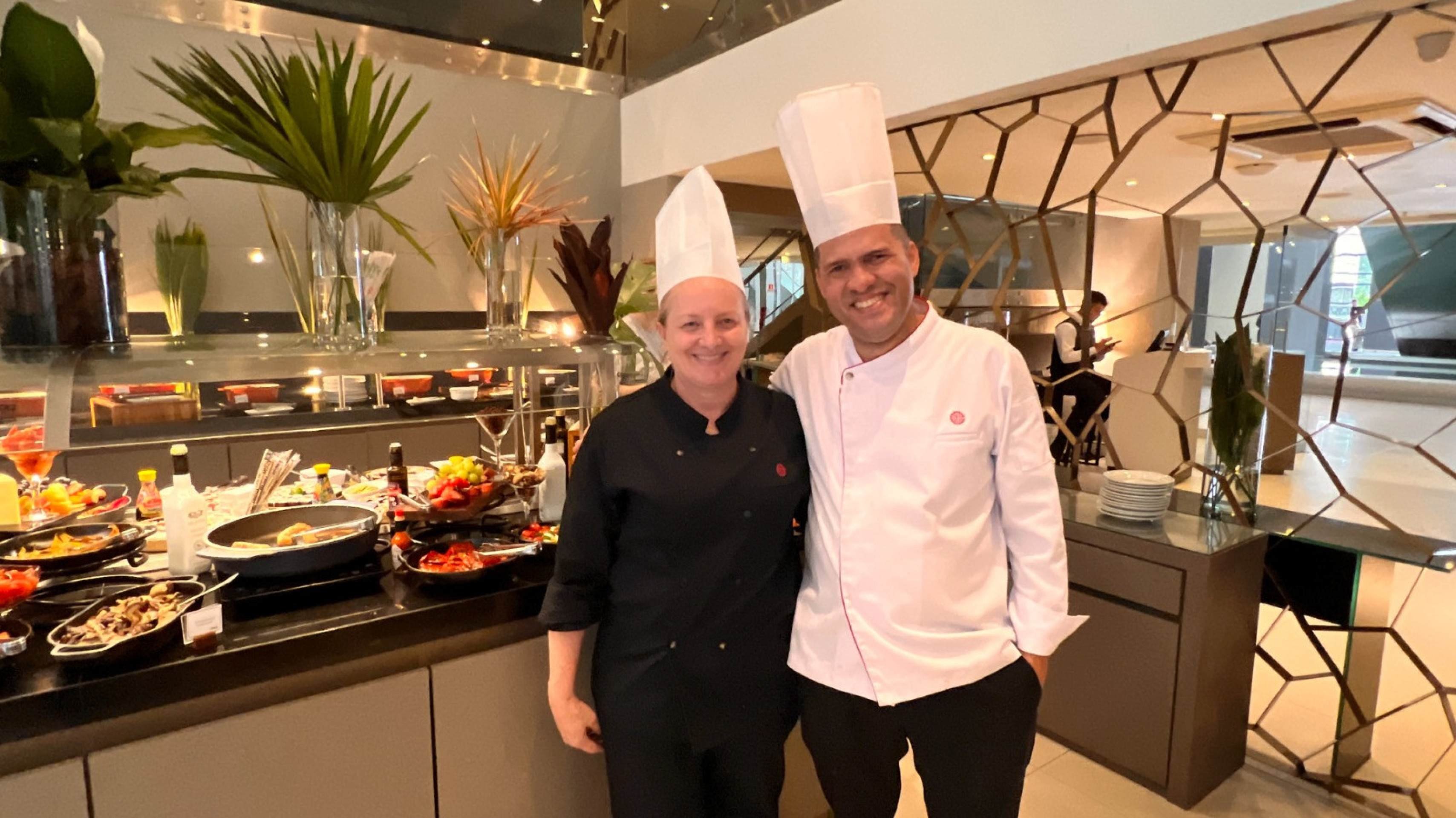 Entre os destaques, o camarão ao champanhe e as marinadas de aspargos, pimentões e berinjelas evocam uma grande mesa de tapas espanholas, harmonizadas com a sangria da casa, na concepção do chef Silvonei, responsável pela cozinha do hotel, do café da manhã ao room service. Nas sobremesas, a chef pâtissière Líria Gabriel imprime delicadeza e precisão técnica, com criações como a tortinha de maçã com sorvete, além de macarrons e pannacota executados e apresentados com a elegância de rede internacional de hospitalidade que tem entre suas bandeiras hotéis como o Tivoli.