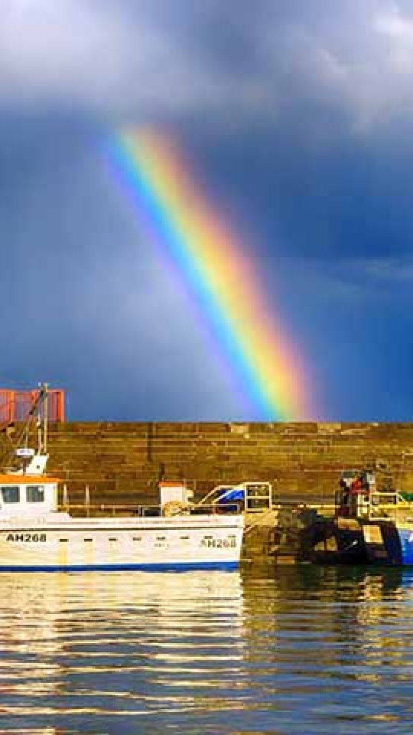 Ilha de Skye - Cidade: Escócia- O clima frequentemente chuvoso e a luz solar intermitente criam condições ideais para a formação de arco-íris sobre as paisagens montanhosas e dramáticas da Ilha de Skye, tornando-a famosa pelos arcos vibrantes que contrastam com o céu nublado.